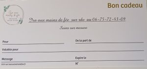 Vous n’avez pas d’idée de cadeau ? Un petit moment chez votre massothérapeute et esthéticienne pour vous relaxer et passer un bon moment fait toujours plaisir. Vous pouvez offrir une carte cadeau à un de vos proches du montant de votre choix.
